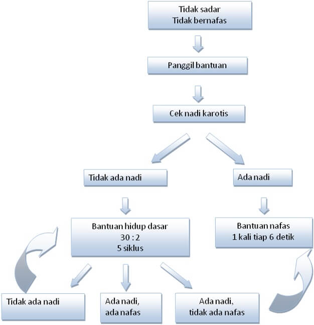 - Setelah 5 siklus, penolong memeriksa apakah orang yang ditolong masih henti jantung, henti nafas, atau keduanya