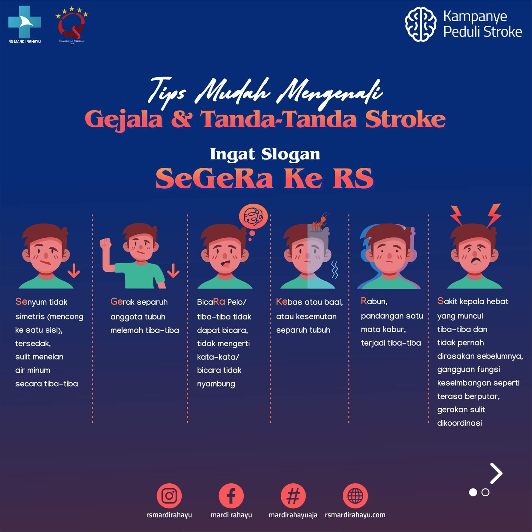 Gejala stroke muncul tiba-tiba dan bervariasi tergantung lokasi daerah stroke. Tips mudah mengenali gejala stroke adalah “SeGera Ke RS”. Se–Senyum tidak simetris, tersedak, sulit menelan air minum, Ge–Gerak separuh anggota tubuh melemah, Ra-bicaRa pelo atau tidak dapat bicara, Ke–Kebas atau kesemutan separuh tubuh, R–Rabun atau pandangan satu mata kabur, dan S–Sakit kepala hebat, gangguan keseimbangan, gerak sulit dikoordinasi. Penanganan stroke dengan pengobatan spesifik harus sesegera mungkin sejak serangan terjadi (Golden Period), yaitu dalam 4,5 jam sejak serangan. Pasien harus dibawa ke rumah sakit dalam golden period agar perawatan optimal serta risiko stroke tingkat keparahan, kecacatan permanen, dan kematian berkurang.